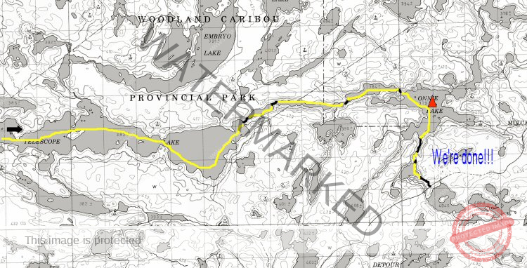Well, our last full day … we're on Onnie Lake … Albert will pick us up at the access point at 1pm tomorrow. We've got three portages to do there 625, 30 and 300 so if we get up at our regular time of 6am we should be on the water by 8:30 and waiting at the access point at noon. We'll brew up a pot of coffee and wait for Albert's arrival.