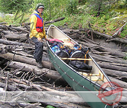 Entering the turn there's a nasty ledge on river left and a log jam on river right. There's a single boulder on river right that we eddy in behind to study the water flow around the log jam. Not seeing a fast flow beneath the logs we approached cautiously and drag the canoe up on the log jam and look for the portage.