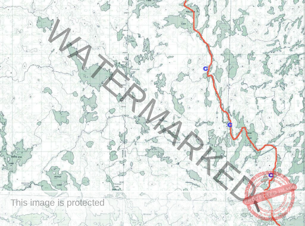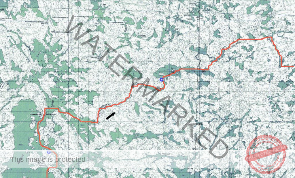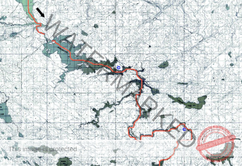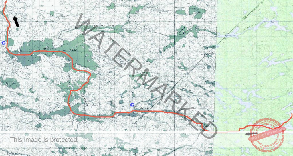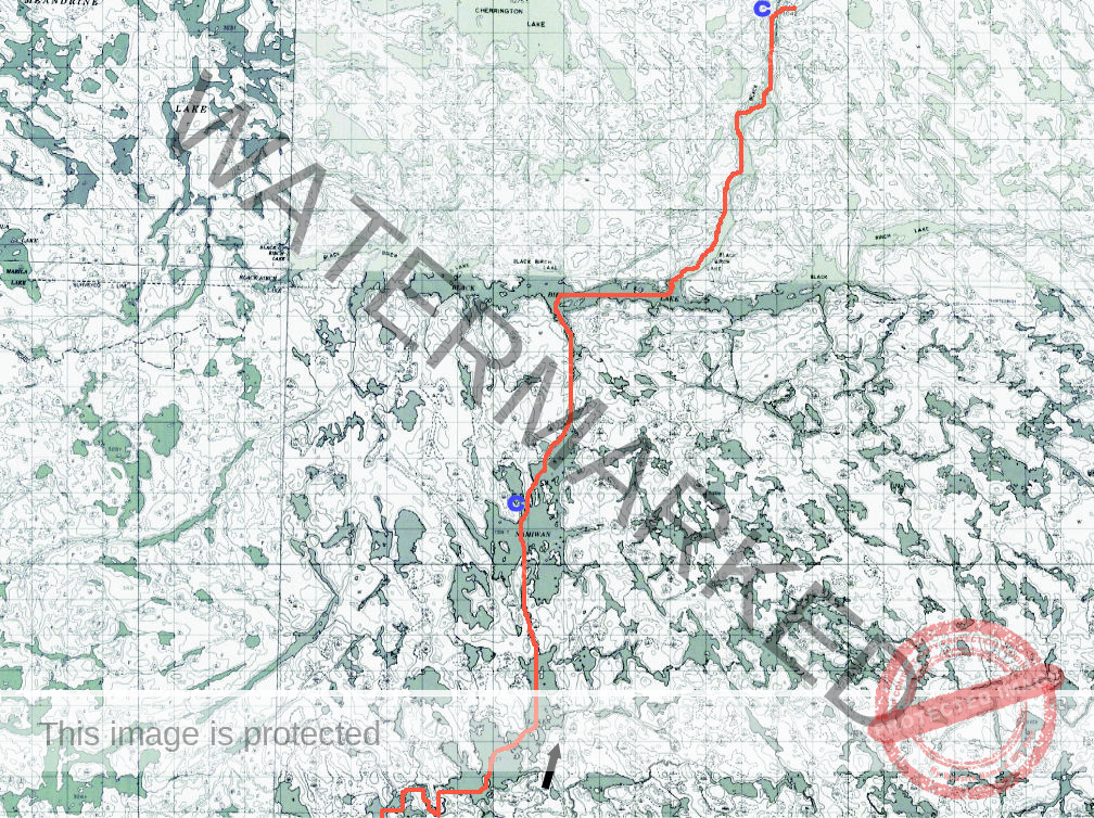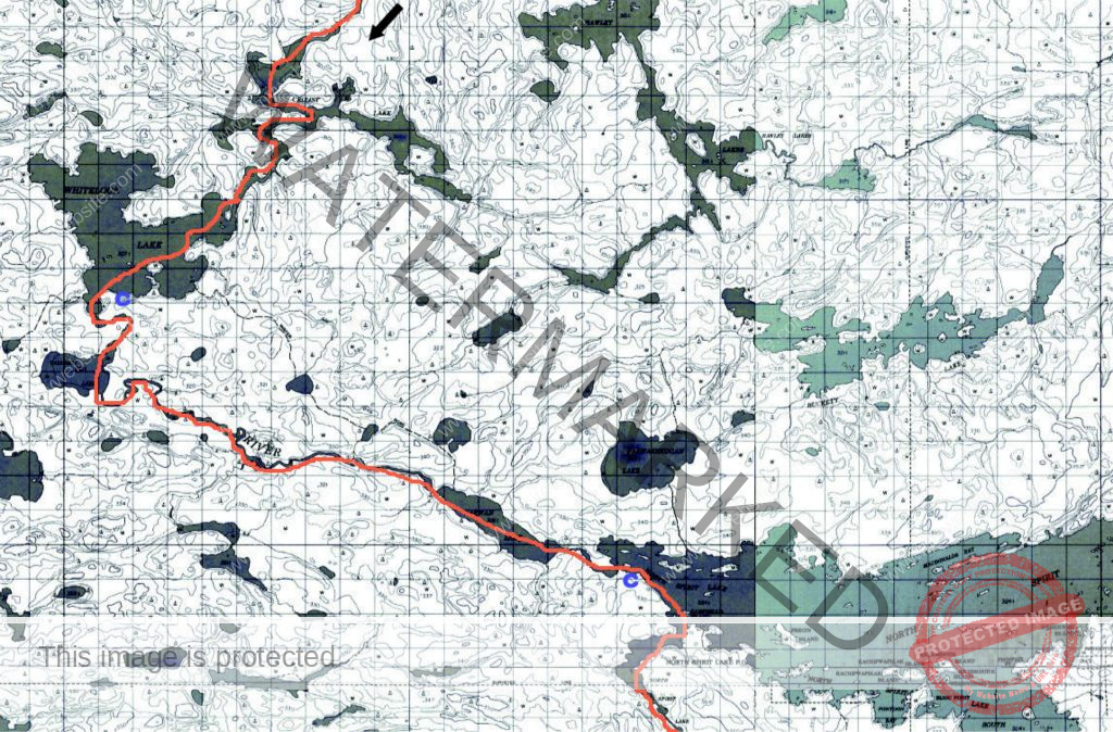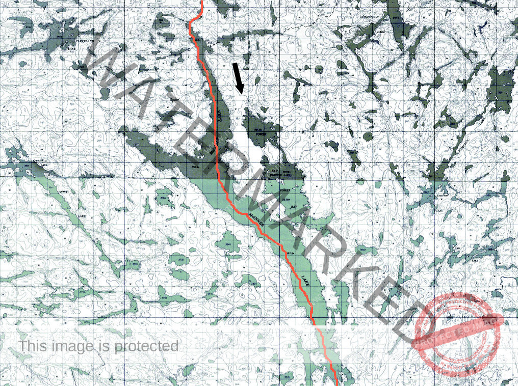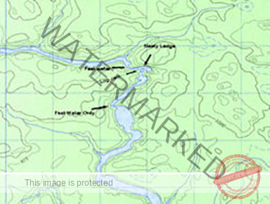 Above is an example of the passage down the Keeper River on the way to Moar Lake. There are two possible routes; the river to the east of Malaher Lake or a portage at the south end of Malaher where a rapid is indicated entering the lake.