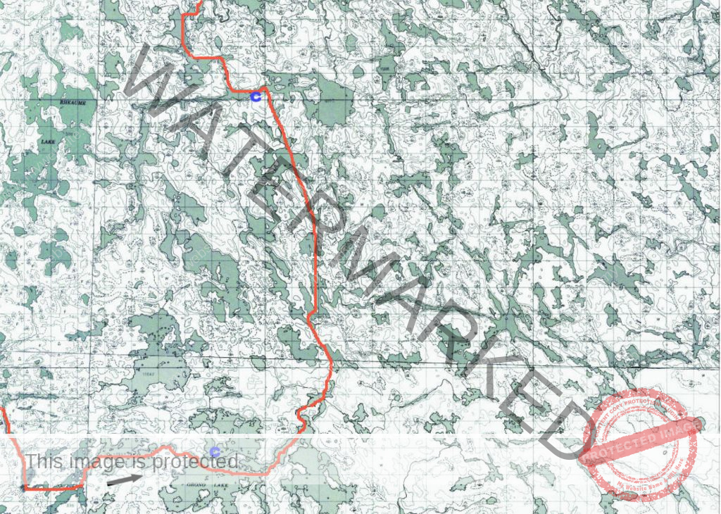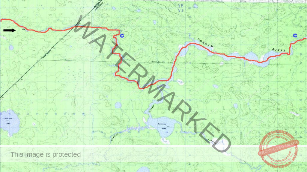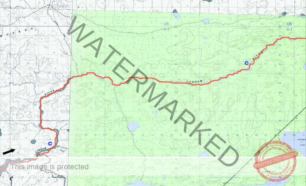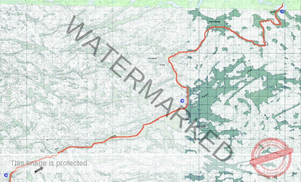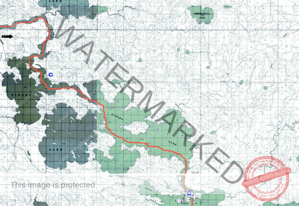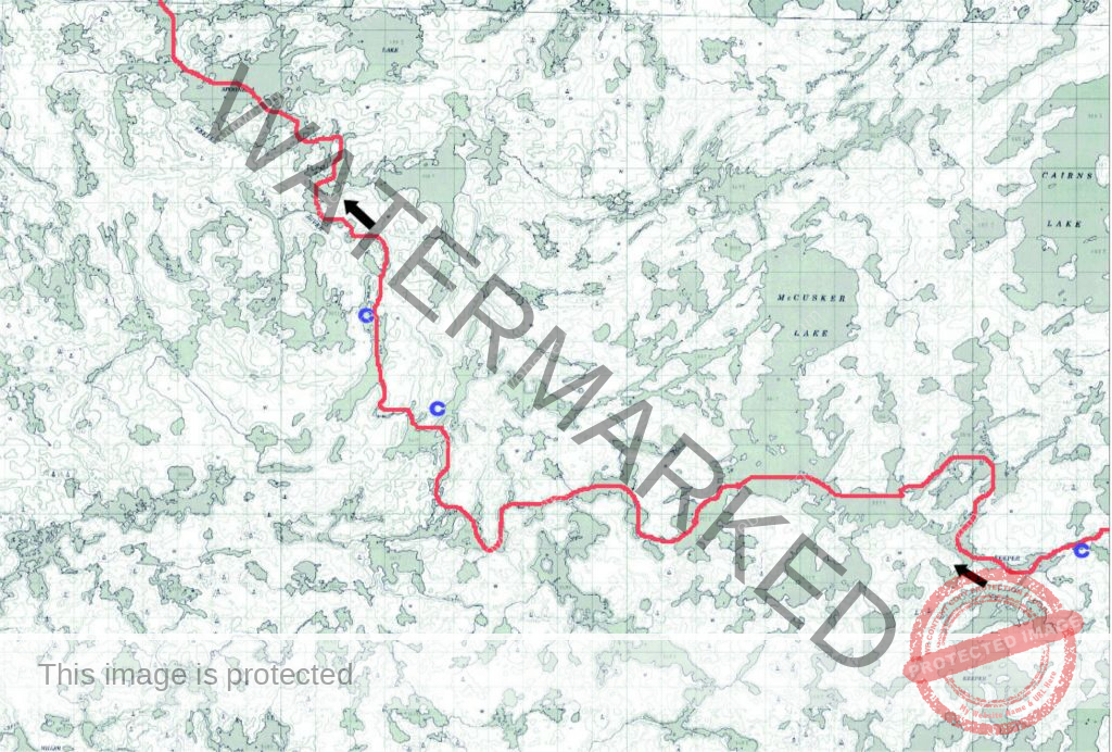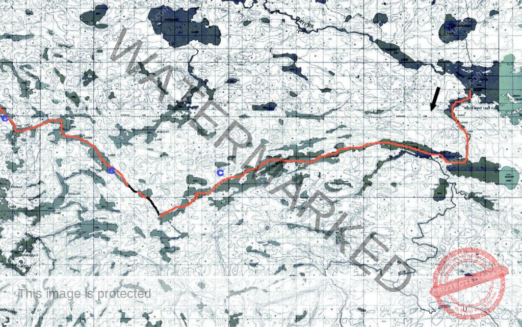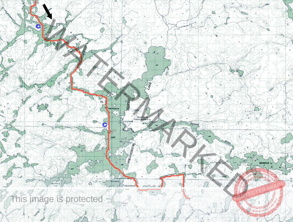 Above is an example of the passage down the Keeper River on the way to Moar Lake. There are two possible routes; the river to the east of Malaher Lake or a portage at the south end of Malaher where a rapid is indicated entering the lake.